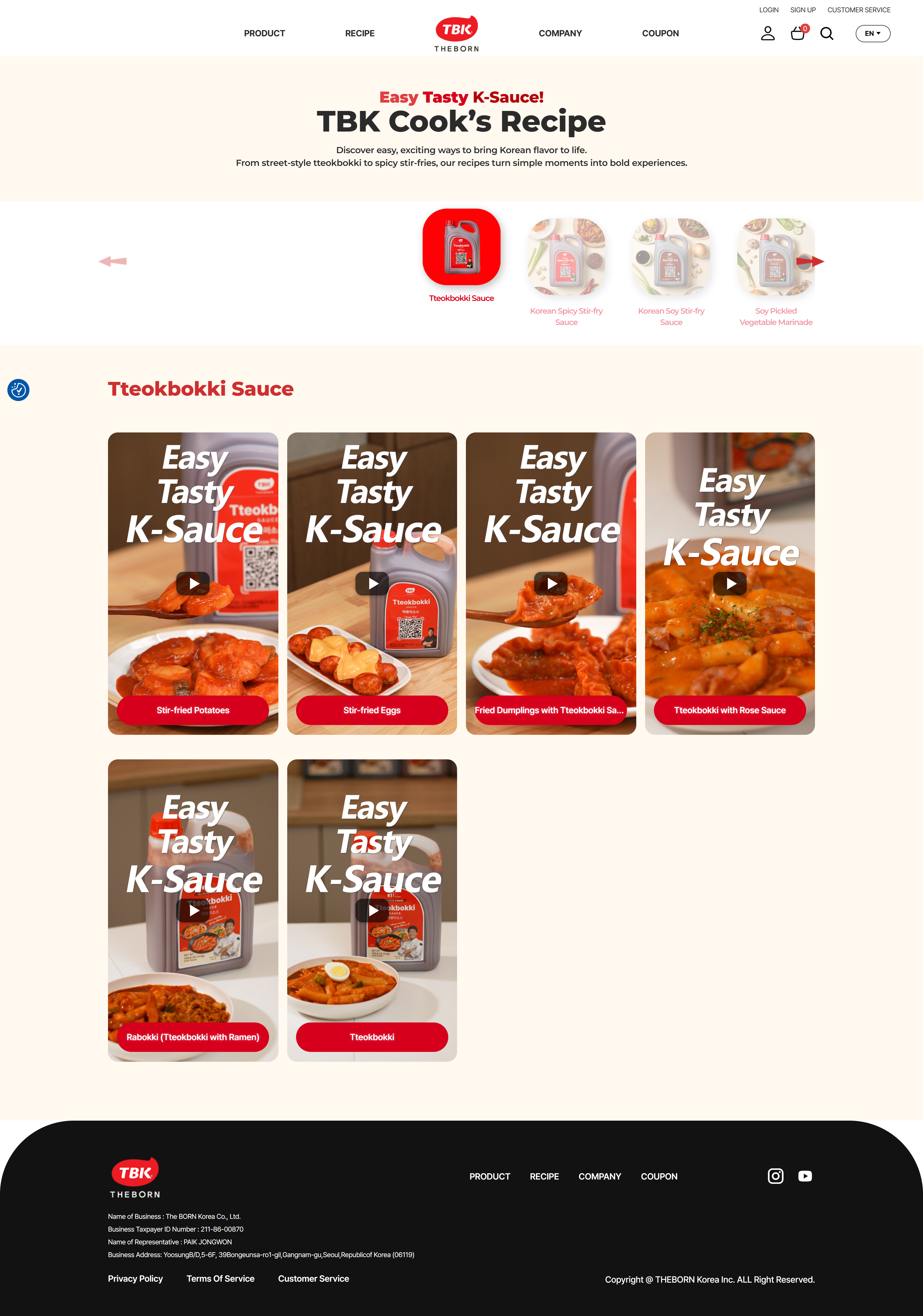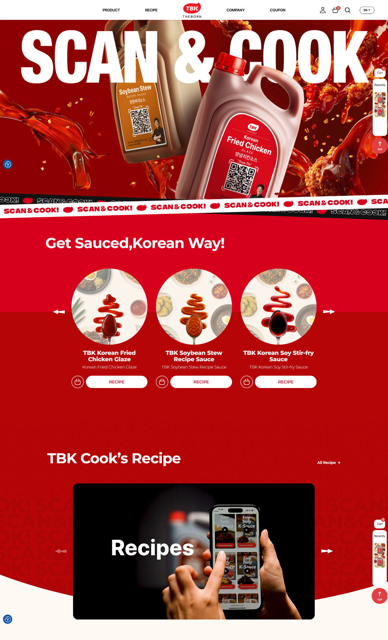 상단 메뉴 구조를 통해 소스 구매, 영상·텍스트 레시피, 브랜드 스토리, 프로모션까지 하나의 흐름으로 자연스럽게 이동할 수 있도록 설계했고, 상품 상세와 레시피 콘텐츠를 유기적으로 연결해 소스를 구매하고 곧바로 조리법까지 따라 할 수 있게 동선을 유도하였습니다. 또한 영문 UI와 글로벌 결제 환경을 고려한 인터페이스를 적용해, 해외 고객도 직관적으로 이용할 수 있게 구축했습니다.