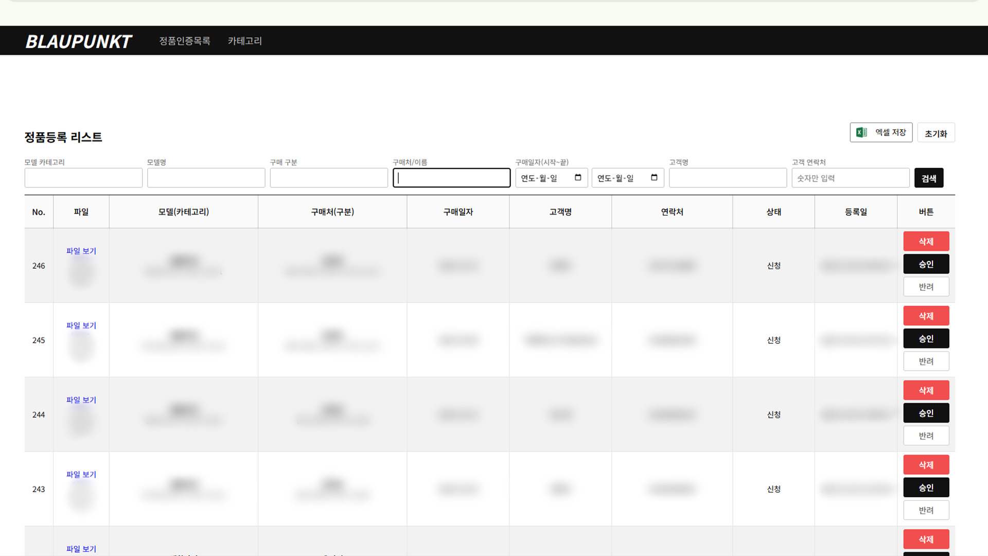 관리자(어드민) 페이지에서는 등록된 정품 인증 내역을 효율적으로 조회 및 관리할 수 있습니다.